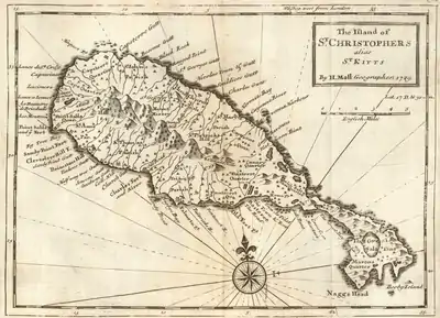Under Gennes the French began reconstruction, but the effort was wasted.[15] During the War of the Spanish Succession (1701–1713) the English on Saint Christophe did not wait for confirmation of the start of war before starting to harass the French. They were aware of the weakness of the French colony and lack of support it could expect from other islands. Gennes knew the English were preparing to attack, but only had about 400 militia to oppose them, plus four companies of marine troops. He proposed that the English observe the old tradition of neutrality on the island, but the English led by Christopher Codrington as general of the English Leeward Islands disagreed. Codrington came to Saint Christopher from Antigua.[16] He brought a regiment of regular troops from Antigua, combined with militia of Antigua and Nevis, for a total of almost 1,200 men. With their local forces the English had more than 2,100 men.[17] On 15 July 1702 four English men of war and about twenty barques appeared off Nevis point and a French refugee arrived with a message from major general Sir Walter Hamilton that called on Gennes to cede the French part of Saint Christopher.[18]