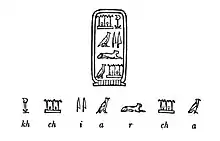 - Champollion, Jean-François (1790-1832) Auteur du texte (1828). Précis du système hiéroglyphique des anciens Égyptiens, ou Recherches sur les éléments premiers de cette écriture sacrée, sur leurs diverses combinaisons, et sur les rapports de ce système avec les autres méthodes graphiques égyptiennes, par M. Champollion le jeune. Seconde édition... augmentée de la lettre à M. Dacier relative à l'alphabet des hiéroglyphes phonétiques employés par les Égyptiens sur leurs monumens de l'époque grecque et de l'époque romaine,... p. 232.