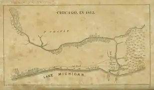 Beaubien first visited Fort Dearborn, which later became the heart of downtown Chicago, shortly after its construction in 1804, but did not buy property there until 1812.[14] In April 1812, he left with his new wife Josette La Framboise and her metis family, all of whom returned to Milwaukee after unfriendly Winnebago killed and scalped several Caucasian settlers on an outlying farm, in what turned out to be a prelude of the Fort Dearborn Massacre of August 15, 1812.[15] Fellow trader John Kinzie, a friend of the fort's commander Nathan Heald, moved his family into the fort, and in early August warned Heald against obeying an evacuation order after the War of 1812 began; Heald's disregard of that advice and compliance with the order to move to Fort Wayne led to the massacre. Meanwhile, in June, Kinzie had killed interpreter Jean LaLime who was a member of a rival faction within the fort, and fled to Milwaukee, where he was greeted with suspicion and found those Indians both anti-American and planning to join western Indians under the direction of British trader Robert Dickson at Green Bay and war against the Americans. After returning to Chicago and failing to convince commander Heald to stay in the fort, Kinzie ultimately enlisted fellow trader Alexander Robinson, who eventually managed to evacuate some survivors to Grand River and Detroit.