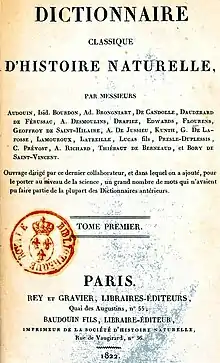 It was during this productive period in 1822, that Bory, along with most of the scientists of his time, including Arago, Brongniart, Drapiez, Geoffroy de Saint-Hilaire, von Humboldt, de Jussieu, de Lacépède, Latreille, etc., began the writing of one of his greatest works, the Dictionnaire classique d'histoire naturelle en 17 volumes (1822-1831).[8]