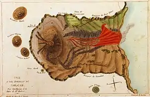 After several stops in Madeira, the Canary islands, and Cape Verde and then rounding the Cape of Good Hope, towards the middle of the trip Bory suddenly left the ship of Captain Baudin with whom he was in conflict[8] and explored alone (and with limited resources) several islands of the African seas.[5][9] He visited Mauritius in March 1800 during a stopover. From there, he sailed to the neighboring island of Réunion,[5] where in October 1801 he ascended the Piton de la Fournaise, the active volcano of the island, and wrote the first general scientific description of it. He gave the name of his former professor Dolomieu, of whose death he had just learned, to one of the craters he described as a mamelon. He gave his own name to the summit crater, the Bory crater.[9] On the way back, he continued his geographical, physical and botanical explorations on the island of Saint Helena[8]