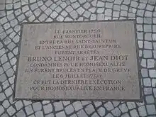 Jean Diot and Bruno Lenoir, French men arrested and charged with the crime of homosexuality in Paris in 1750, were the last persons executed in France as punishment for homosexuality. In 2014, Paris officials installed a memorial plaque at the site of their arrest.