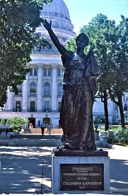 During the 1893 World's Columbian Exposition Miner and Helen Farnsworth Mears were named artists-in-residence at the Wisconsin Building. At that time Miner was commissioned to create a work of art representing the state. She created Forward; "Forward" is the motto of the state of Wisconsin. The statue was afterward purchased by women's suffrage organizations and "presented to the state of Wisconsin on behalf of the women's suffrage movement".[3]