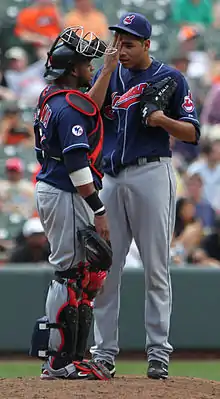 Gómez relies primarily on a sinker that he grips like a two-seam fastball, that ranges from about 90–92 miles per hour (145–148 km/h), as well as a slider and a changeup, the latter of which he uses primarily against left-handed hitters.[29] Very occasionally, he mixes in a cutter.[30] Over time, both his two seam fastball and slider have improved in terms of movement according to Carlos Santana, who served as the catcher for him both at the minor league and major league levels.[4]