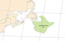 The Jeanne d'Arc Basin is an offshore sedimentary basin located about 340 kilometres (~210 miles) to the basin centre, east-southeast of St. John's, Newfoundland and Labrador. This basin formed in response to the large scale plate tectonic forces that ripped apart the super-continent Pangea and also led to sea-floor spreading in the North Atlantic Ocean. This basin is one of a series of rift basins that are located on the broad, shallow promontory of continental crust known as the Grand Banks of Newfoundland off Canada's east coast. The basin was named after a purported 20 metres (11 fathom) shoal labelled as "Ste. Jeanne d'Arc" on out-dated bathymetric charts [1] and which was once thought to represent a local exposure of basement rocks similar to the Virgin Rocks.[2]