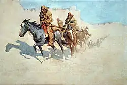 The next spring (1823), Major Henry ordered Smith to go back down the Missouri to the Grand River to take a message to Ashley to buy horses from the Arikaras, who due to a recent skirmish with Missouri Fur Company men were antagonistic to the white traders.[24] Ashley, who was bringing supplies as well as 70 new men upriver by boat,[25] met Smith at the Arikara village on May 30.[26] They negotiated a trade for several horses and 200 buffalo robes and planned to leave as soon as possible to avert trouble, but weather delayed them, and before they could depart, an incident provoked an Arikara attack. Forty Ashley men, including Smith, were caught in a vulnerable position, and 12 were killed in the ensuing battle.[27][lower-alpha 6] Smith's conduct during the defense was the foundation of his reputation: "When his party was in danger, Mr. Smith was always among the foremost to meet it, and the last to fly; those who saw him on shore, at the Riccaree fight, in 1823, can attest to the truth of this assertion."[29]