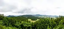 Yongnunioreum (Hangul: 용눈이오름) is located in Jongdal-ri Gujwa-eup Jeju-si.[12] The top of Yongnunioreum is composed of three peaks around the top of north-east direction, and there is an elliptical crater somewhat opened in the east–west direction. Overall, the shape of mountain is a horseshoe-shaped crater that spreads shallowly toward the east slope. At the foot of the west slope, there are a small parasitic volcano with marginated top and two conical parasitic volcanos, Aloreum, and it is recorded as a complex Oreum formed with two or more crater along with Yongnunioreum (Hangul: 용눈이오름) and Donurioreum (Hangul: 도너리오름). Especially, a complex volcano made up of various craters is known as an unusual shape.[12] It is said that it is called Oreum because of the shape of Oreum, the figure of the dragons playing, lying and rising in regard to the origin of the place name.[13]