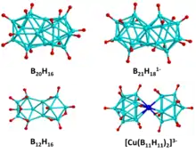 - Bernhardt, E.; Brauer, D. J.; Finze, M.; Willner, H. (2007). "closo-[B21H18]−: A Face-Fused Diicosahedral Borate Ion". Angew. Chem. Int. Ed. Engl. 46 (16): 2927–2930. doi:10.1002/anie.200604077. PMID 17366499.