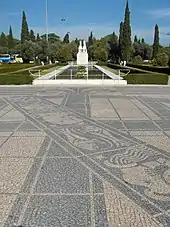 As part of the celebrations marking the centenary of modern Portugal in 1939, yet more remodelling was completed in the monastery and tower.[8] During these projects, the baldachin and tomb of Alexandre Herculano were dismantled and the cloister patio was paved.[8] In 1940 the space in front of the monastery was redesigned for the Portuguese Exposition.[8] The Casa Pia vacated the interior spaces of the cloister and the tombs of Camões and Vasco da Gama were transferred to the lower choir. A series of windows designed by Rebocho and executed by Alves Mendes were completed in 1950.[8]