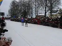 ![]() The 2007 Vasaloppet, Oskar Svärd (in black) is still behind Jerry Ahrlin (in blue), when a few hundreds of meters remain. | |