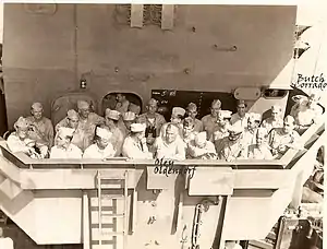 On 15 December 1944, Oldendorf was promoted to vice admiral and made commander of Battleship Squadron 1.[3] He commanded battleships in the landings at Lingayen. On 6 January 1945, Oldendorf, together with his guest British admiral Bruce Fraser, survived a destructive kamikaze strike on the bridge of USS New Mexico.[15] He was wounded breaking his collar bone at Ulithi on 11 March 1945, when his barge hit a buoy.[16] Oldendorf assumed command of Task Force 95 in July, and led this force on two sweeps of the East China Sea.[17] He was wounded, breaking several ribs, when his flagship Pennsylvania was torpedoed by a Japanese aircraft on 12 August 1945.[18] On 22 September 1945, Oldendorf commanded the occupation of Wakayama and dictated terms of surrender to Vice Admiral Hoka and Rear Admiral Yofai.[19]