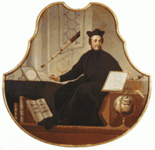 Ferdinand Orban (1655–1732), Professor of Mathematics, made a valuable collection of natural and artificial curiosities and scientific instruments, as well as texts on foreign languages.[55] The collection began as a museum of mathematical objects, and was expanded by donations from noblemen and Jesuit missionaries.[56] Orban started his collection in Innsbruck in 1689, and it was moved several times before reaching the Jesuit College in 1724.[55] Around 1725 the Orban Hall was built to house the collection. The corners of the ceiling of the Baroque-style hall held portraits by Christoph Thomas Scheffler (1699–1756). In frames the shape of a double bass they depict Athanasius Kircher, Christoph Scheiner, Christopher Clavius and Johann Baptist Cysat.[57] The vault of the hall was decorated in stucco with frescoes and oil paintings. It depicted the heavens and earth, the arts and sciences, theology and the wisdom of God. The four paintings of scientists have survived, as has the stucco. The rest has been destroyed.[56] Most of the collection is now held by the Universitätsbibliothek in Munich.[55]