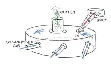 A jet mill grinds materials by using a high speed jet of compressed air or inert gas to impact particles into each other.[1] Jet mills can be designed to output particles below a certain size while continuing to mill particles above that size, resulting in a narrow size distribution of the resulting product.[2] Particles leaving the mill can be separated from the gas stream by cyclonic separation.[3]