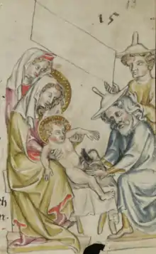 The Jewish hat is frequently used in medieval art to denote Jews of the Biblical period. Often the Jews so shown are those shown in an unfavourable light by the story being depicted, such as the money-changers expelled by Jesus from the Temple (Matthew 21:12–17), but this is by no means always the case. The husband of Mary, Saint Joseph, is often shown wearing a Jewish hat, and Jesus himself may be shown wearing one, especially in depictions of the Meeting at Emmaus, where his disciples do not recognise him at first (Luke.24.13-32).[18] Sometimes it is used to distinguish Jews from other peoples such as Egyptians or Philistines. It is often depicted in art from times and places where the hat does not seem to have actually been commonly worn by Jews, "as an external and largely arbitrary sign devised by Christian iconographers", one of a number of useful visual ways of identifying types of persons in medieval art.[19]