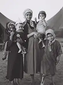 Jewish women were distinguished from others in the western regions of the Roman Empire by their custom of veiling in public. The custom of veiling was shared by Jews with others in the eastern regions.[28] The custom petered out among Roman women, but was retained by Jewish women as a sign of their identification as Jews. The custom has been retained among Orthodox women.[29] Evidence drawn from the Talmud shows that pious Jewish women would wear shawls over their heads when they would leave their homes, but there was no practice of fully covering the face.[30] In the medieval era, Jewish women started veiling their faces under the influence of the Islamic societies they lived in.[31] In some Muslim regions such as in Baghdad, Jewish women veiled their faces until the 1930s. In the more lax Kurdish regions, Jewish women did not cover their faces.[32]
