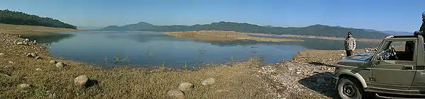 A major incident in the history of the reserve followed the construction of a dam at the Kalagarh river and the submerging of 80 km2 (31 sq mi) of prime low lying riverine area.[10] The consequences ranged from local extinction of swamp deer to a massive reduction in hog deer population.[10] The reservoir formed due to the submerging of land has also led to an increase in aquatic fauna and has additionally served as a habitat for winter migrants.[10]