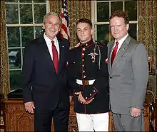 The Navy Cross is presented to James H. Webb, Jr., First Lieutenant, U.S. Marine Corps, for extraordinary heroism while serving as a Platoon Commander with Company D, First Battalion, Fifth Marines, First Marine Division (Reinforced), Fleet Marine Force, in connection with combat operations against the enemy in the Republic of Vietnam. On July 10, 1969, while participating in a company-sized search and destroy operation deep in hostile territory, First Lieutenant Webb's platoon discovered a well-camouflaged bunker complex that appeared to be unoccupied. Deploying his men into defensive positions, First Lieutenant Webb was advancing to the first bunker when three enemy soldiers armed with hand grenades jumped out. Reacting instantly, he grabbed the closest man and, brandishing his .45 caliber pistol at the others, apprehended all three of the soldiers. Accompanied by one of his men, he then approached the second bunker and called for the enemy to surrender. When the hostile soldiers failed to answer him and threw a grenade that detonated dangerously close to him, First Lieutenant Webb detonated a claymore mine in the bunker aperture, accounting for two enemy casualties and disclosing the entrance to a tunnel. Despite the smoke and debris from the explosion and the possibility of enemy soldiers hiding in the tunnel, he then conducted a thorough search that yielded several items of equipment and numerous documents containing valuable intelligence data. Continuing the assault, he approached a third bunker and was preparing to fire into it when the enemy threw another grenade. Observing the grenade land dangerously close to his companion, First Lieutenant Webb simultaneously fired his weapon at the enemy, pushed the Marine away from the grenade, and shielded him from the explosion with his own body. Although sustaining painful fragmentation wounds from the explosion, he managed to throw a grenade into the aperture and completely destroy the remaining bunker. By his courage, aggressive leadership, and selfless devotion to duty, First Lieutenant Webb upheld the highest traditions of the Marine Corps and of the United States Naval Service.[12]