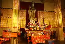 - To the east of the main hall is the Guanyin Hall. In the center of the hall is a statue of the goddess made out of camphor wood. Standing on a lotus-shaped base, it is 6.2 meters tall and weighs 5 metric tons