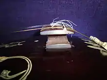 Typical of javari on an instrument with preferably long strings, is that on the soundboard the strings run over a wide bridge with a very flat parabolic curve. The curvature of the bridge has been made in a precise relation to the optimum level of playing, or more exact, a precise amplitude of each string. Any string, given length, density, pitch and tension, wants to be plucked within the limits of its elasticity, and so vibrate harmoniously with a steady pitch. When a string of a tanpura is plucked properly, it produces a tone with a certain amplitude that will slowly decrease as the tone fades out. In this gradual process, the string, moving up and down according to its frequency, will make a periodic grazing contact with the curved surface of the bridge. The exact grazing-spot will gradually shift up the sloping surface, as a function of the decreasing amplitude, finally dissolving into the rest-position of the open string. In this complex dynamic sonation process, the shifting grazing will touch upon micro-nodes on the string, exciting a wide range of harmonics in a sweeping mode. The desired effect is that of a cascading row of harmonics in a rainbow of sound. As an analogy, a properly shaped and adjusted javari is similar to the refraction of white light through a prism. When the prism is of good proportions and quality and used properly, the phenomenon should produce itself. "The voice of an artist which is marked by a rich sound resembling that produced by two consonants played together, is often loosely known to have Javārī in it, although such use is arbitrary."[1]