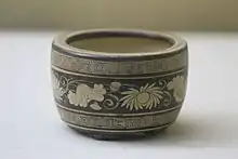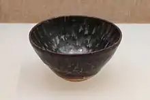 Jizhou ware or Chi-chou ware (Chinese: 吉州窯; pinyin: Jízhōu yáo; Wade–Giles: Chi-chou yao) is Chinese pottery from Jiangxi province in southern China; the Jizhou kilns made a number of different types of wares over the five centuries of production. The best known wares are simple shapes in stoneware, with a strong emphasis on subtle effects in the dark glazes, comparable to Jian ware, but often combined with other decorative effects. In the Song dynasty they achieved a high prestige, especially among Buddhist monks and in relation to tea-drinking. The wares often use leaves or paper cutouts to create resist patterns in the glaze, by leaving parts of the body untouched.