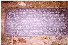 "This plain sarcophagus, (once dignified as having contained the remains of Joan, daughter of King John, and consort of Llewelyn ap Iorwerth, Prince of North Wales, who died in the year 1237), having been conveyed from the Friary of Llanfaes, and alas, used for many years as a horsewatering trough, was rescued from such an indignity and placed here for preservation as well as to excite serious meditation on the transitory nature of all sublunary distinctions. By Thomas James Warren Bulkeley, Viscount Bulkeley, Oct 1808"