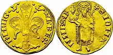 From early 1349 onwards, all documents for the Kingdom were issued in the names of both husband and wife, and Louis was indisputably in control of military fortresses.[89] On coins issued during their joint reign, Louis' name always preceded Joanna's.[90] Although he was not officially recognised by Clement as king and co-ruler until 1352, it is likely that Neapolitans considered him their monarch from the moment he started acting as such.[89]