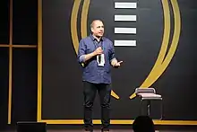 Joaquin Zihuatanejo (born 1971 in Dallas, Texas) is an American slam poet and teacher. In 2004, Zihuatanejo competed in the National Poetry Slam as part of the Dallas Poetry Slam team, which placed third.[1] He also appeared on HBO's Def Poetry in 2005.[2] In 2008, he won the Individual World Poetry Slam and was the winner of the World Cup of Poetry Slam in 2009.[2] He is a featured faculty member at the 2018 Conference on Poetry and Teaching at The Frost Place in Franconia, NH. Currently, Zihuatanejo resides near his hometown of Dallas with his wife and two daughters.[2] Outside of poetry, Zihuatanejo taught English and creative writing for seven years.[2]