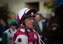 The first form of jockey's cap appeared in the late 17th century and was generally made of velvet with a peak or visor and a hatband fastened at the front with a buckle.[1] This early style of cap is preserved in the "State Dress" of the musicians of the Household Cavalry, who adopted it at the behest of Queen Victoria.[2] During the 19th century, a lighter version began to be worn by racing jockeys;[1] it was made of silk in the colours representing the jockey's stable.[3] Modern jockey's caps are made oversized so that they can be worn over a protective helmet.