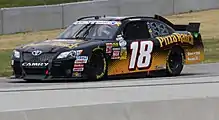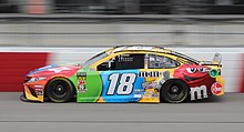 On August 14, 2007, it was announced that 22-year-old Kyle Busch had signed a contract to drive the number 18 with Joe Gibbs Racing through 2010, leaving Hendrick Motorsports' number 5 car after a successful but controversial tenure with the organization.[52] Mars, Inc.'s M&M's brand was signed as the team's primary sponsor, leaving Robert Yates Racing, while longtime partner Interstate Batteries scaled down to be a secondary sponsor and six race primary sponsor.[53] Joe Gibbs racing also left General Motors in favor of becoming Toyota's highest-profile team.[10] Busch gave Toyota its first Cup win on March 9, 2008, leading a race-high 173 laps to win the Kobalt Tools 500 at Atlanta Motor Speedway. In his first year in the 18, Busch had brought the car back to its former glory, winning 7 additional races (Talladega, Darlington, Dover, Infineon, Daytona, Chicagoland, and Watkins Glen) and would finish tenth in points.