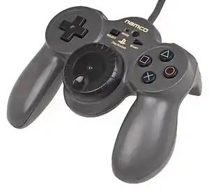 Originally released in 1998 as part of a special edition package with R4: Ridge Racer Type 4,[1] it was designed to combine the function of a steering wheel controller, while maintaining the size of a standard PlayStation controller.[2] This is accomplished by a dial approximately 3 inches in diameter in the center of the controller (almost in the same location as the DualShock analog sticks).[3]