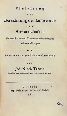 The book Einleitung zur Berechnung der Leibrenten und Anwartschaften, published in Leipzig in 1785 (first part) and 1786 (second part) was a landmark of actuarial science. It contains an extensive synthesis of previous work on the subject, from Halley's mortality table to Richard Price's Observations on reversionary payments. It is recognized by actuaries for featuring the first risk measure ever (the Risico der Casse);[6] moreover it offers some insights in mathematical statistics: by using an approximation of the binomial distribution, Tetens tried to compute the confidence level of a given sampling procedure.[7]
