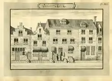 Johannes Vermeer was baptized within the Reformed Church on 31 October 1632.[15][16][lower-alpha 1] His mother, Digna Baltens (c. 1596 – 1670[20][21][22]),[lower-alpha 2] was from Antwerp.[23][24][25][18][22] Digna's father, Balthasar Geerts,[21] or Gerrits,[22] (born in Antwerp in or around 1573)[21] led an enterprising life, and was arrested for counterfeiting.[21][18] Vermeer's father, named Reijnier Janszoon, was a middle-class worker of silk or caffa (a mixture of silk and cotton or wool).[Note 1] He was the son of Jan Reyersz and Cornelia (Neeltge) Goris.[lower-alpha 3] As an apprentice in Amsterdam, Reijnier lived on fashionable Sint Antoniesbreestraat, a street with many resident painters at the time. In 1615, Reijnier married Digna. The couple moved to Delft and had a daughter named Gertruy who was baptized in 1620.[Note 2] In 1625, Reijnier was involved in a fight with a soldier named Willem van Bylandt who died from his wounds five months later.[27] Around this time, Reijnier began dealing in paintings. In 1631, he leased an inn, which he called "The Flying Fox". In 1635, he lived on Voldersgracht 25 or 26. In 1641, he bought a larger inn on the market square, named after the Flemish town "Mechelen". The acquisition of the inn constituted a considerable financial burden.[Huerta 1] When Reijnier died in October 1652, Vermeer took over the operation of the family's art business.