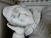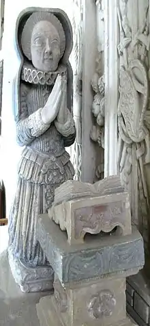Sir John Acland's monument in Broadclyst Church was described by Pevsner as "one of the most sumptuous Jacobean monuments in Devon and the most splendid of a related group".[24] It was commissioned by Sir John during his lifetime[2] and bears the dates 1613[25] and 1614.[26] He lies recumbent, in full armour, propped up on his right elbow, with his two widows kneeling at prayer at his head and feet.[2] It was probably constructed by John Deymond, an Exeter mason.[24] The Renaissance style[18] comprises columns, strapwork, cartouches, obelisks, fruit and putti[24] It displays the following Latin inscriptions:[25] Anno Domini 1613; Mors janua vitae (Death is the gateway to life) and the well-known Mors mihi lucrum[27] (Death to me is reward); Post tenebras spero lucem (After darkness I hope for light); Caro mea requiescit in spe (May my flesh rest in hope); A Deo omnis victoria (All victory comes from God). A rectangular space above his effigy which should have contained a marble tablet inscribed with his epitaph remains blank, as it was in 1697 when described by John Prince.[25]