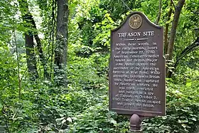 André rode on in safety until 9 a.m. on 23 September, when he came near Tarrytown, New York, where armed militiamen John Paulding, Isaac Van Wart, and David Williams stopped him.[9][10]