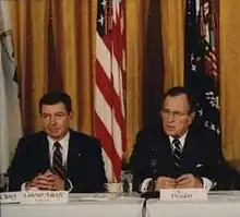 In March 2004, the Justice Department under Ashcroft ruled President Bush's domestic intelligence program illegal.[25] Shortly afterward, he was hospitalized with acute gallstone pancreatitis.[25] White House Counsel Alberto Gonzales and Chief of Staff Andrew Card Jr. went to Ashcroft's bedside in the hospital intensive-care unit, to persuade the incapacitated Attorney General to sign a document to reauthorize the program.[25] Acting Attorney General James Comey alerted FBI Director Robert Mueller III of this plan, and rushed to the hospital, arriving ahead of Gonzales and Card, Jr. Ashcroft, "summoning the strength to lift his head and speak", refused to sign.[25][26][27] Attempts to reauthorize the program were ended by President Bush when Ashcroft, Comey and Mueller threatened to resign.[25]