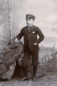 John Bauer was born and raised in Jönköping, the son of Josef Bauer, a man of Bavarian origin, and Emma Charlotta Wadell, from a farming family from the town Rogberga just outside Jönköping.[1][2] Josef Bauer came to Sweden in 1863, penniless. He founded a successful charcuterie business at the Östra Torget in Jönköping.[2] The family lived in the apartment above the shop until 1881 when the construction of their house in Sjövik was completed.[3] John, born in 1882, lived at the Villa Sjövik by the shore of Lake Rocksjön with his parents and two brothers, one older and one younger; his only sister died at a young age.[2] The family home would remain central to him long after he lived on his own.[3][4] His initial schooling was at the Jönköpings Högre Allmäna Läroverk (The Jönköping Public School of Higher Education),[1] followed by the Jönköpings Tekniska Skola (The Jönköping Technical School)[5] from 1892 to 1898.[1] He spent most of his time drawing caricatures of his teachers and daydreaming, something not appreciated by his teachers.[4][2]