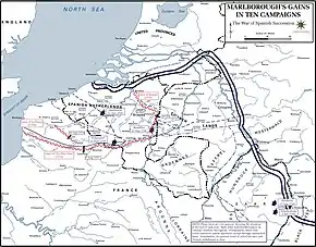 The early months of 1706 also proved frustrating for the Duke as Louis XIV's generals gained early successes in Italy and Alsace. These setbacks thwarted Marlborough's original plans for the coming campaign, but he soon adjusted his schemes and marched into enemy territory. Louis XIV, equally determined to fight and avenge Blenheim, goaded his commander, Marshal Villeroi, to seek out Monsieur Marlbrouck.[73] The subsequent Battle of Ramillies, fought in the Spanish Netherlands on 23 May, was perhaps Marlborough's most successful action, and one in which he had himself characteristically drawn his sword at the pivotal moment. For the loss of fewer than 3,000 dead and wounded (far fewer than Blenheim), his victory had cost the enemy some 20,000 casualties, inflicting in the words of Marshal Villars, "the most shameful, humiliating and disastrous of routs". The campaign was an unsurpassed operational triumph for the English general.[74] Town after town subsequently fell to the Allies. "It really looks more like a dream than truth", wrote Marlborough to Sarah.[75]
