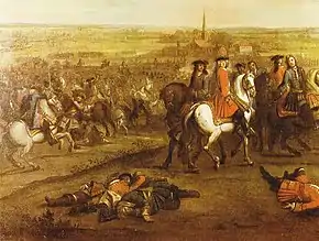 Marlborough's first official act was to assist in the remodelling of the army – the power of confirming or purging officers and men gave the Earl the opportunity to build a new patronage network which would prove beneficial over the next two decades.[36] His task was urgent, for less than six months after James II's departure, England joined the war against France as part of a powerful coalition aimed at curtailing the ambitions of Louis XIV. With his experience it was logical that Marlborough took charge of the 8,000 English troops sent to the Low Countries in the spring of 1689; yet throughout the Nine Years' War (1688–97) he saw only three years service in the field, and then mostly in subordinate commands. However, at the Battle of Walcourt on 25 August 1689 Marlborough won praise from the Allied commander, Prince Waldeck – "... despite his youth he displayed greater military capacity than do most generals after a long series of wars ... He is assuredly one of the most gallant men I know".[37]