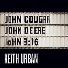 "John Cougar, John Deere, John 3:16" is a song written by Shane McAnally, Ross Copperman, and Josh Osborne and recorded by New Zealand-born Australian country music singer Keith Urban. It was released on June 9, 2015[1] as the first single from Urban's 2016 album Ripcord.[3] The song has a slow 1970s funk vibe that carries distinct drum loops and several time changes, with production from Urban and longtime co-producer Dann Huff. The song has received positive reviews from music critics who praised the production and lyrics, as well as Urban's return to traditional country with a brand-new sound.