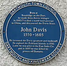 Davis was born in the parish of Stoke Gabriel in Devon circa 1550, and spent his childhood in Sandridge Barton nearby. It has been suggested that he learned much of his seamanship as a child while plying boats along the river Dart, and went to sea at an early age. His childhood neighbours included Adrian Gilbert and Humphrey Gilbert and their half-brother Walter Raleigh.[1] From early on, he also became friends with John Dee.[2]