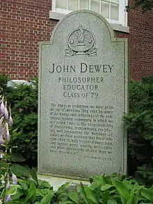 John Dewey was born in Burlington, Vermont to a family of modest means.[14] He was one of four boys born to Archibald Sprague Dewey and Lucina Artemisia Rich Dewey. Their second son was also named John, but he died in an accident on January 17, 1859. The second John Dewey was born October 20, 1859, forty weeks after the death of his older brother. Like his older, surviving brother, Davis Rich Dewey, he attended the University of Vermont, where he was initiated into Delta Psi, and graduated Phi Beta Kappa[15] in 1879. A significant professor of Dewey's at the University of Vermont was Henry Augustus Pearson Torrey (H. A. P. Torrey), the son-in-law and nephew of former University of Vermont president Joseph Torrey. Dewey studied privately with Torrey between his graduation from Vermont and his enrollment at Johns Hopkins University.[16][17]