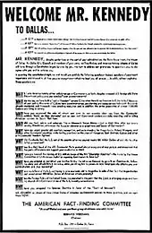 The assassination of John F. Kennedy on November 22, 1963, and the subsequent murder of prime suspect Lee Harvey Oswald by night club owner Jack Ruby have spurred numerous conspiracy theories.[1] These include alleged involvement of the CIA, the Mafia, Vice President Lyndon B. Johnson, Cuban Prime Minister Fidel Castro, the KGB, or some combination of these entities. The original FBI investigation and Warren Commission report, as well as an alleged "benign CIA cover-up", have led to the claim that the federal government deliberately covered up crucial information in the aftermath of the assassination.[2][3][4] Former Los Angeles District Attorney Vincent Bugliosi estimated that a total of 42 groups, 82 assassins, and 214 people had been accused at one time or another in various conspiracy scenarios.[5]
