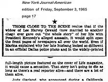 Vincent Bugliosi devoted two pages of his book Reclaiming History: The Assassination of President John F. Kennedy to journalist Dorothy Kilgallen. Kilgallen was publicly skeptical of the official version of the assassination of President Kennedy and Jack Ruby’s shooting of Lee Oswald. During 1964 and 1965, she wrote several newspaper articles on the subject and many relevant short items in her daily column.[75][76][77] On February 23, 1964, the New York City newspaper New York Journal-American, where Kilgallen had worked since its formation in 1937, published her article about a conversation she had had with Jack Ruby, when he was seated at his defense table during a recess in his murder trial.