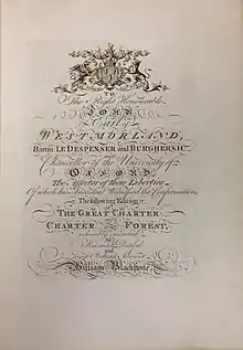 - Blackstone, William (1759). The Great Charter and Charter of the Forest, with other Authentic Instruments: To which is Prefixed an Introductory Discourse, Containing the History of the Charters. By William Blackstone, Esq; Barrister at Law, Vinerian Professor of the Laws of England, and D.C.L. Oxford: Clarendon Press. OCLC 4547269.
