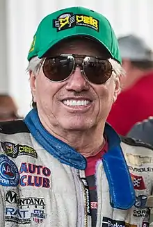 John Harold Force (born May 4, 1949 in Bell Gardens, California) is an American NHRA drag racer. He is a 16-time NHRA and 1 time AHRA Funny Car champion driver and a 21-time champion car owner. Force owns and drives for John Force Racing (JFR). He is one of the most dominant drag racers in the sport with 151 career victories.[5] He graduated from Bell Gardens High School and briefly attended Cerritos Junior College to play football.[6] He is the father of drag racers Ashley Force Hood, Brittany Force, and Courtney Force. His oldest daughter Adria Hight is the CFO of JFR.