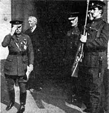 French's wife did not accompany him to India (they seem to have lived apart for a while after his return from Egypt, although if so they must have been reconciled as his daughter Essex was conceived in 1886).[41] When commanding the 19th Hussars in India, French was cited for adultery with the wife of a brother officer during his leave (inevitably christened "French leave" by his colleagues) in the Indian hills; he was lucky this did not terminate his career.[42] There were also unsubstantiated rumours that French had had affairs with the daughter of an Anglo-Indian railway official and also, earlier in his career, with his commanding officer's wife.[43] A later tale, that he had once been the lover of the Irish nationalist Maud Gonne, appeared in Mary Colum's Life and the Dream (1947), although his biographer comments that it "lacks firm evidence".[44]