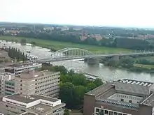 Arnhem was captured and liberated in April 1945 and a Bailey bridge was erected alongside the remains of the bridge. The temporary bridge was too low for ships to pass underneath and was replaced by a higher Bailey bridge. Later, a new Rijnbrug was rebuilt in exactly the same style as the destroyed bridge; it opened in 1948.[5] The bridge was depicted in the 1977 film A Bridge Too Far, but because the buildings near the bridge in Arnhem had changed so much since the war, the film was actually shot at Deventer where a similar bridge spans the IJssel.