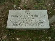 He died on May 8, 1964, at his home on 3035 M St, NW in Washington, D.C. Surviving him were his wife Patricia D. Underhill, one son John Garrett Underhill III, and a sister Mrs. Ernest Eltinge of Warwick, New York. After his death he was buried in the Underhill Burying Ground in Lattingtown, New York.[18] His wife Patricia D. Underhill died on December 15, 1973. A memorial service was held in her memory at Christ Church, Washington, D.C.[19] John Garrett Underhill III lived at 10220 Memorial Dr. in Houston, Texas. An obituary for him ran in the March 22, 1987 issue of the Houston Chronicle, Section 2, Page 15.