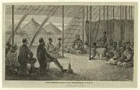 Local Church Missionary Society records indicate that Speke fathered a daughter whilst staying at the court of Muteesa I the Kabaka (or King) of Buganda.[14] Whilst staying at the court Speke was given two girls aged about 12 and 18 from the entourage of the Queen Mother. Speke appears to have had sexual relations with both of them, before handing over the youngest (whom he named 'Kahala') to another man.[14] Speke fell in love with the elder girl, 'Meri', according to his diaries (which were redacted when they were published as books later).[9] While Meri proved loyal to Speke and fulfilled her task at being a "wife" to him as commanded by the Queen Mother, Speke was distressed because he thought she had no love or deep attachment to him. He "divorced her on the spot" in April 1862 after she defied his orders regarding the sacrifice of a goat.[14] Whilst Meri visited Speke several times after this incident, the couple did not reconcile. Speke claimed to have tried to arrange a better relationship for Meri with another man, without success it seems.[9]