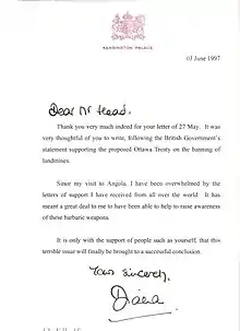 Head received a personal letter from Diana, Princess of Wales dated 3 June 1997. She wrote, "...it is only with the support of people such as yourself, that this terrible issue will finally be brought to a successful conclusion".